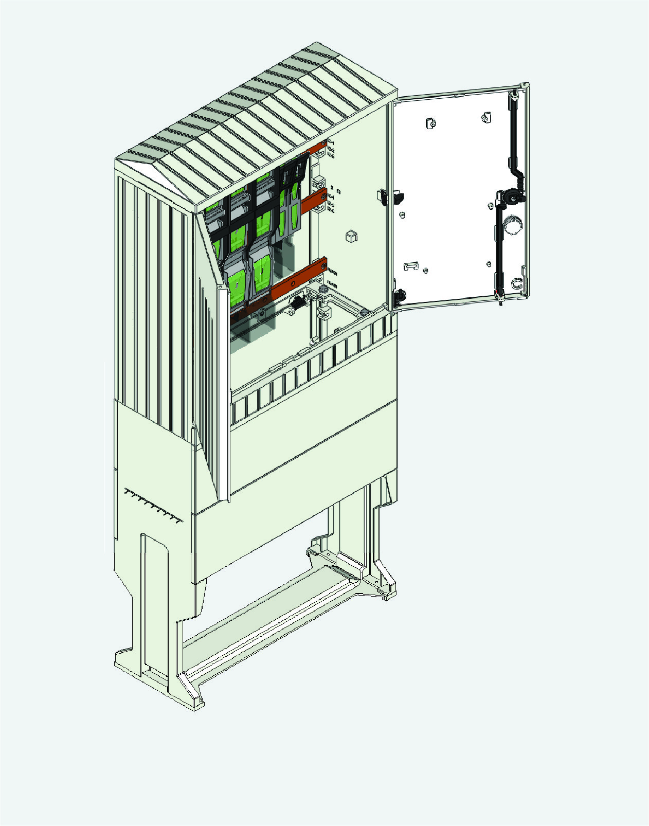 Das Gehäuse des Kastens ist zusammen mit dem Boden aus Isolierstoff, einem hochwertigen vorgespannten und glasfasverstärkten Polyester hergestellt, der gegen mechanische, thermische und UV-Einflüsse beständig ist. Es besteht die Möglichkeit der Montage des Gehäuses an den Betonboden.